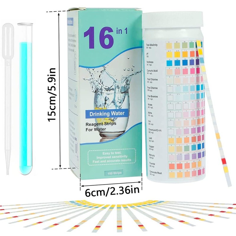 - This 16-in-1 home water test kit comes with a tube and a pipette, avoiding water pollution and making it easy to use. With the 16-in-1 water quality test paper, you can quickly and conveniently test the water quality in just a few seconds.