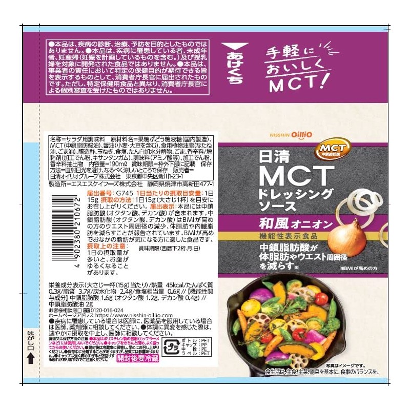 - Ingredients: High-fructose corn syrup (made in Japan), MCT (medium-chain fatty acid oil), soy sauce (contains wheat, soybean), edible vegetable oil (rapesame oil, brewed vinegar, onions, salt, protein hydrolyze, sesame, spices, thickening agent (processed starch, xanthan gum), seasoning (amino acids, etc.), processed starch, seasoning (amino acids, etc.), processed starch, spices)