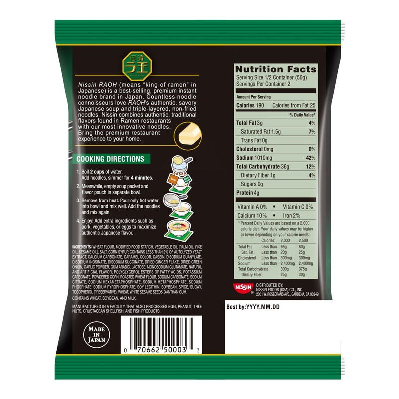 - Nissin RAOH delivers restaurant quality noodles through use of state-of-the-art technology: the triple-layer process, this allows different textures to combine with a non-fried process resulting in unprecedented quality