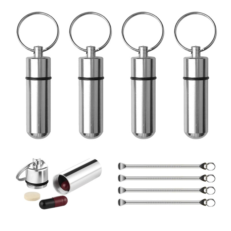 NITAIUN Pack of 4 Pill Box Key Ring Waterproof Portable Aluminium Pill Box with 4 Spoons Pill Holder Tablet Box Organiser Pill Container for Camping Hiking Travel Outdoor (Silver)