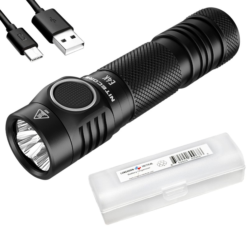 - INCLUDED IN THIS BUNDLE - A new NITECORE E4K flashlight, NL2150HPR 5000mAh USB-C rechargeable battery, CR123 battery adapter, USB-C charging cable, two-way metal pocket clip, holster, lanyard, and LumenTac battery case.