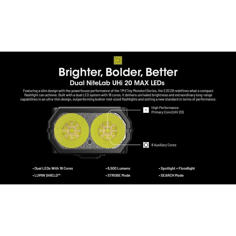 - EDC29 - Bubble Lantern: Max Output: 6,500 Lumens; Max Beam Distance: 370 Meters; Max Beam Intensity: 35,360 cd; Max Runtime: 61hrs; LED: 2 x UHi 20; Reflector: OP; Includes: NItecore EDC29 Flashlight and Nitecore Bubble Lantern