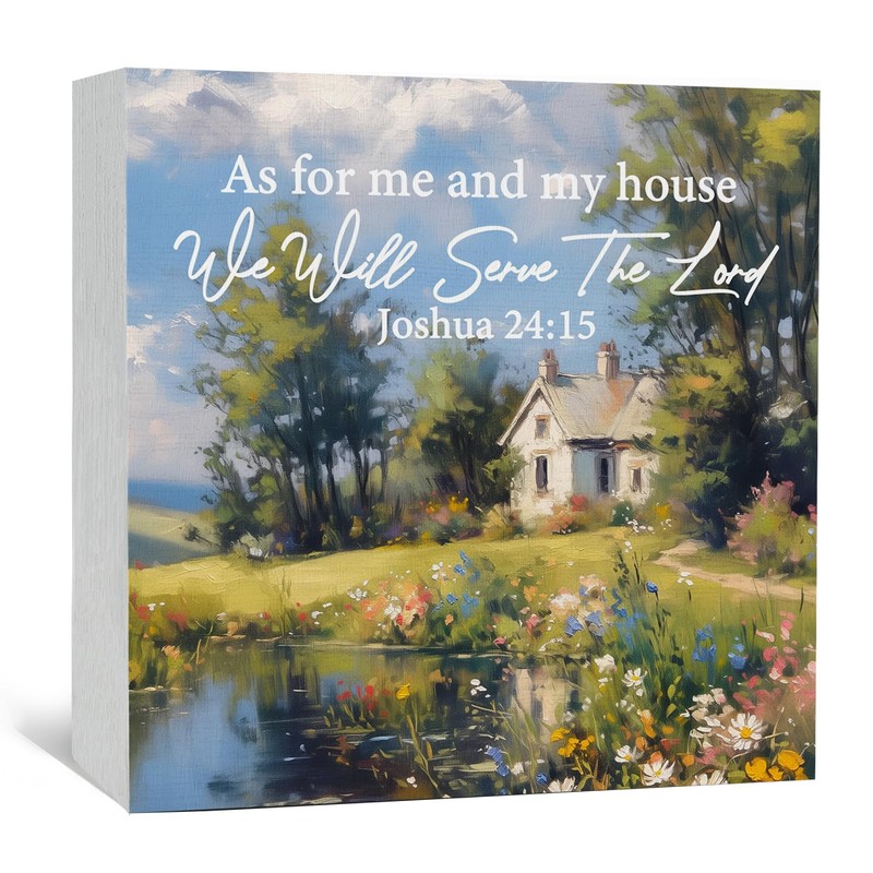Nitelat Farmhouse Christian Wooden Box Signs, Christian Desk Decor, Rustic Wildflowers Joshua 24:15 Bible Verse Scripture Wood Decoration Home Decor for Desk Table Shelf 5x5 Inch