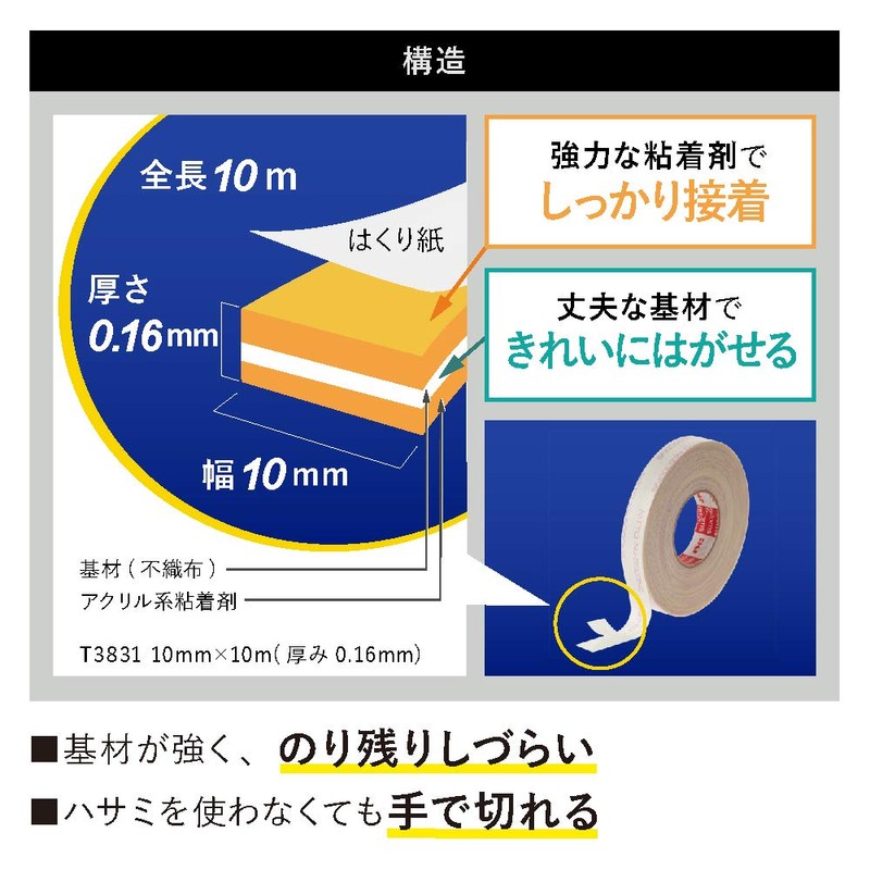 Nitoms T3831 Removable Double-Sided Tape, Strong Adhesion, Easy, No Residue, Indoor Width 0.4 inches (10 mm) x Length 32.8 ft (10 m) x Thickness 0.006 inches (0.16 mm), 1 Roll