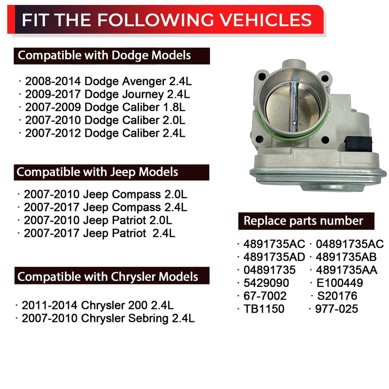 - [Vehicle Fitment] Compatible with Chrysler 200 2011-2014, Sebring 2007-2010; Compatible with Jeep Compass Patriot 2007-2017; Compatible with Dodge Avenger 2008-2014, Journey 2009-2017, Caliber 2007-2012-----1.8L 2.0L 2.4L.For more detailed fitment information, please check the fitment table