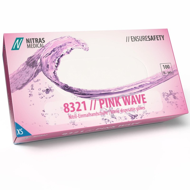 Nitras 8321 Pink Wave Non-Sterile Medical Nitrile Disposable Gloves, Pink, Pack of 100 in Dispenser Box, Latex-Free & Powder-Free, Touchscreen Compatible XS