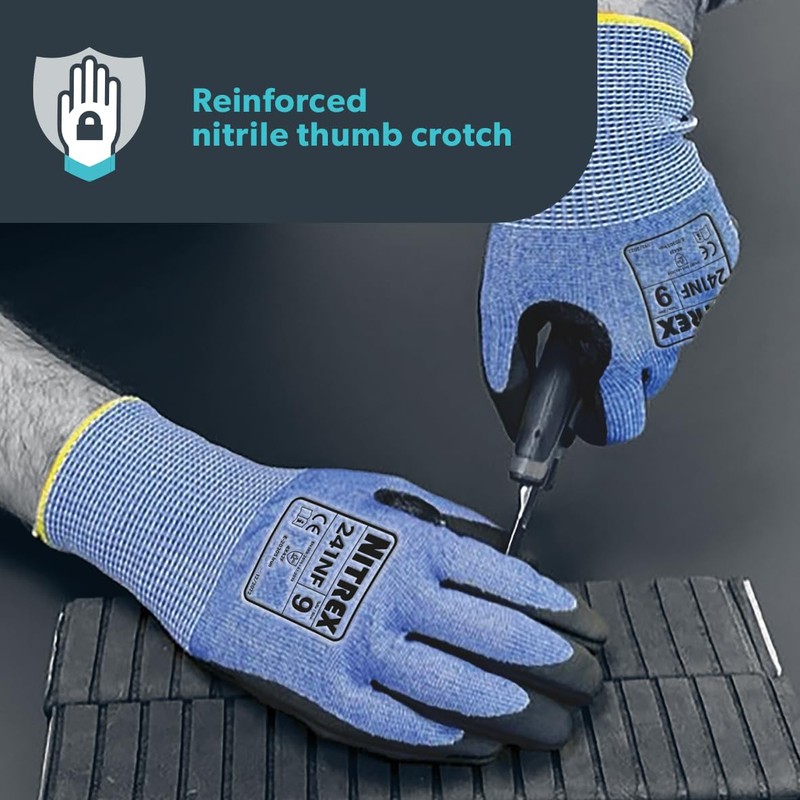 - The reinforced nitrile thumb crotch offers extra protection when handling abrasive material and increases the life of the glove