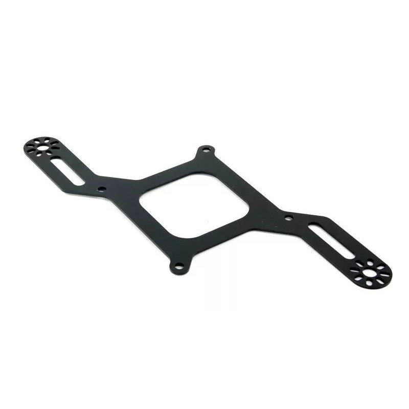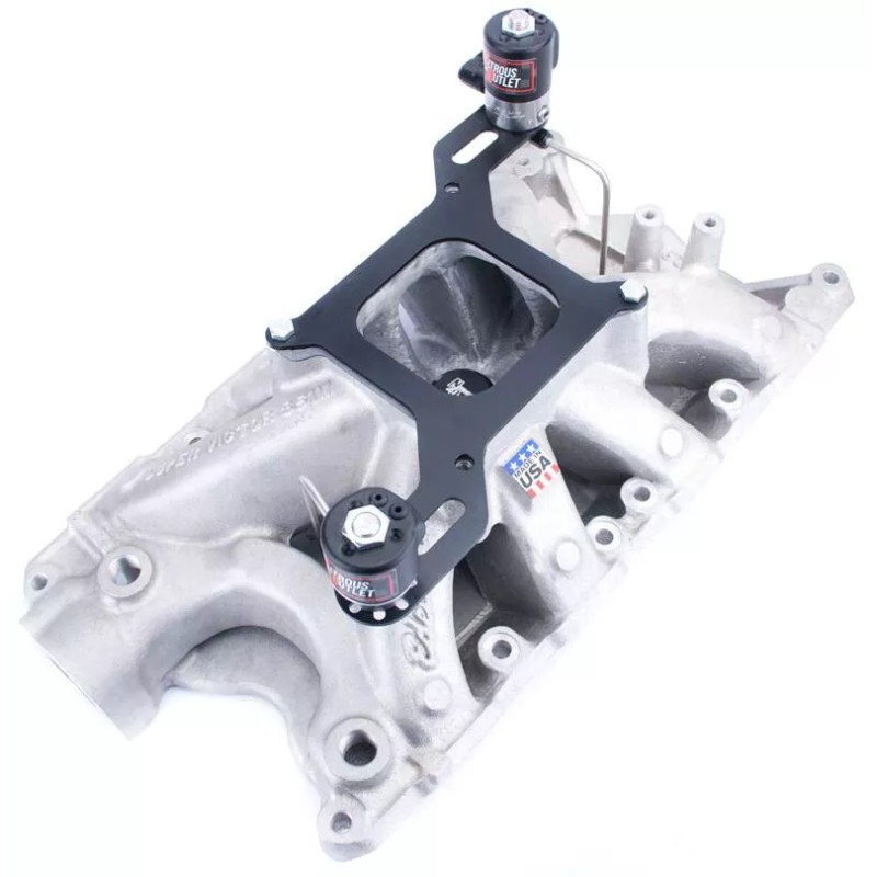 Specifically for intake manifolds with a carburetor or throttle body and commonly used in conjunction with Nitrous Outlet's Puck system, spray bar system, Stinger plate system or Hornet plate system. Will not clear the carburetor accelerator pump with out a burst plate or spacer between bracket and carburetor.