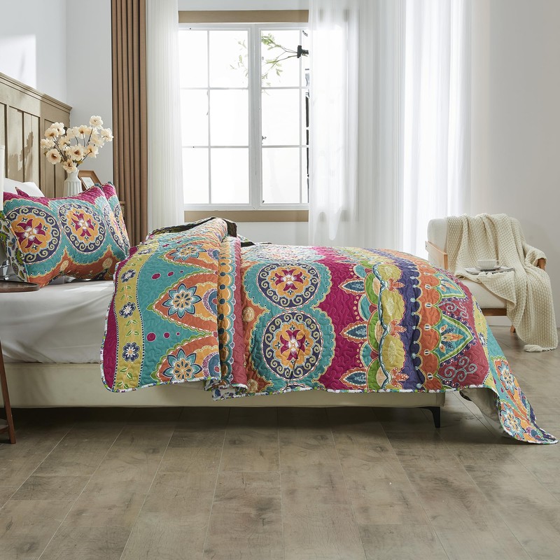- Transform your bedroom into a vibrant sanctuary with our quilt's rich colors and patterns. Designed to complement any bedroom theme, it adds a touch of elegance and style to your decor.