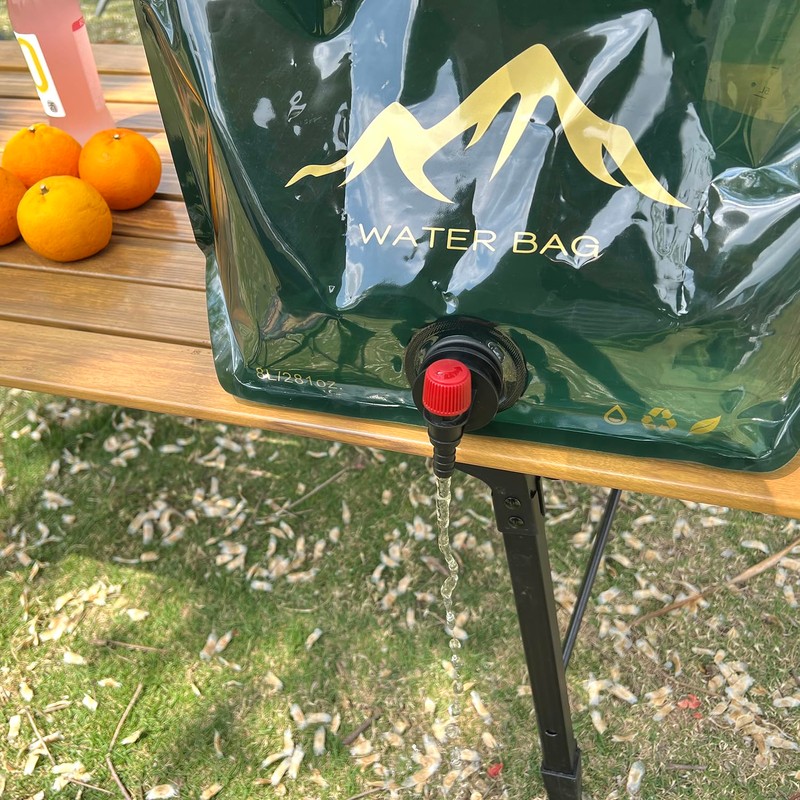 Featuring a convenient rotating spigot, dispensing water is effortless and mess-free.  Whether you're filling up a water bottle, washing dishes at your campsite, or need water for cooking, the spigot provides a controlled and steady stream.  The integrated handle makes carrying and hanging the water bag easy, offering versatile placement options whether you're suspending it from a tree branch or placing it on a picnic table.  Make our Foldable Water Container your essential hydration companion for every outdoor adventure!