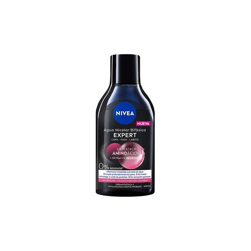 Elimina maquillaje a prueba de agua, impurezas y grasa sin frotar con la fórmula experta de NIVEA. Su tecnología bifásica con micelas naturales y extracto de té negro limpia profundamente y reoxigena tu piel, dejándola suave, fresca y libre de residuos.