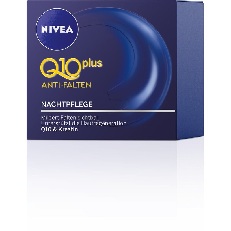 - Anti-ageing night cream with a formula with Q10 and creatine: reduces wrinkle depth, supports skin regeneration during the night, slows down appearance of new wrinkles, moisturising fragrance, suitable for women from 30+ and all skin types, free from parabens and mineral oils, skin compatibility dermatologically tested, application: daily after facial cleansing, applying the cream to face, neck and décolletage, avoid eye contact. Quick retraction without F Box contents: 1 Nivea Q10 plus anti-wrinkle night cream in a jar, 50 ml