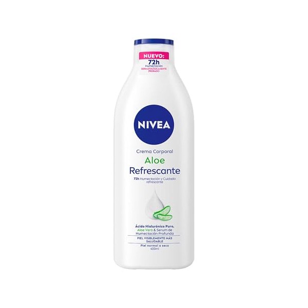 - Experimenta la máxima hidratación con la Crema Corporal NIVEA Aloe Refrescante, que ofrece una sensación de hidratación profunda, refrescante y rápida durante 72 horas que puedes sentir y ver. Su fórmula única, con el doble de ingredientes humectantes, combina humectantes naturales, lípidos que retienen la humedad y aceites nutritivos para mantener el agua en la piel, evitando su evaporación hacia otras zonas. De esta manera, tu piel queda protegida contra la sequedad al reducir la pérdida de agua y aumentar su nivel de hidratación. Nuestros rigurosos métodos de prueba han demostrado que esta crema corporal humectante de NIVEA, en combinación con el Serum de Hidratación Profunda, penetra en las capas más profundas de la piel para retener la humedad y ofrecer una humectación prolongada de hasta 72 horas