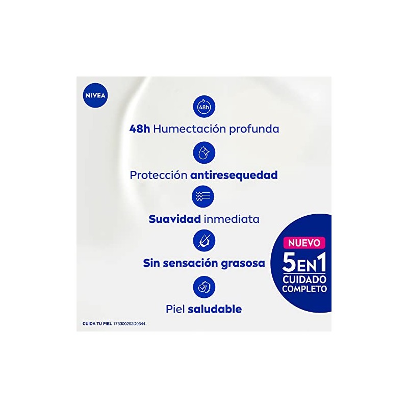 - resequedad y suavidad inmediata sin sensación grasosa para una piel saludable. Enriquecida con Serum de Humectación Profunda NIVEA, aceite de almendras natural y vitamina E, reconocidos por sus propiedades humectantes y nutritivas. Logra una piel notablemente más suave con aspereza reducida después de una sola aplicación, promoviendo una hidratación duradera para un cutis de aspecto saludable. Restaura la apariencia de la piel seca con nuestra fórmula indulgente, dejándola con una sensación de renovación y rejuvenecimiento. Disfruta de la textura suave y cremosa que se absorbe rápidamente sin dejar residuos grasos. Ideal para uso diario, aumentando la hidratación de la piel, nuestra crema corporal es un complemento esencial para tu rutina de cuidado de la piel.
