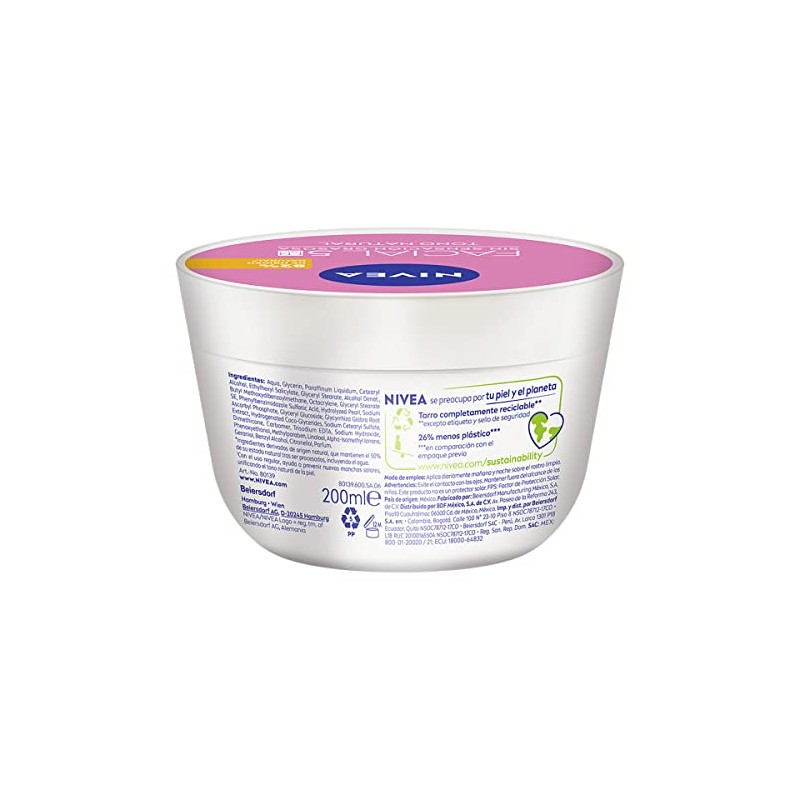 Complementa tu rutina de cuidado facial con nuestra crema facial hidratante 5 en 1 Aclarado Natural de NIVEA. Su innovadora fórmula contiene Hidro nutrientes que al entrar en contacto con la piel del rostro se funden llegando hasta la capa más profunda proporcionando una hidratación intensiva, sin dejar residuos grasosos en la superficie. Aclarara las manchas de la piel gracias a su ingrediente activo de extracto de perla, rápida absorción y textura ligera al mismo tiempo que protege tu piel de los rayos del sol gracias a su protección solar FPS15. Nuestra crema facial brinda 24hrs de humectación sin sensación grasosa, nutrición gracias a su ingrediente manteca de karité, rápida absorción y textura ligera. Puede usarlo todos los días en toda su piel, ya que se absorbe rápidamente y está dermatológicamente aprobado para ser utilizado en la piel de la cara y el cuerpo.