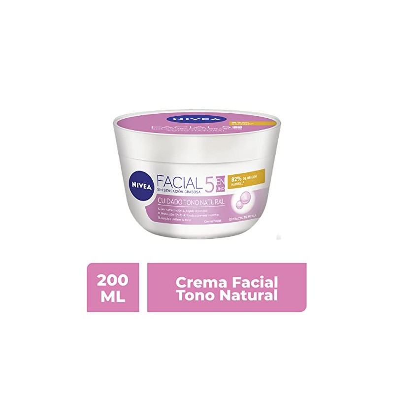 Complementa tu rutina de cuidado facial con nuestra crema facial hidratante 5 en 1 Aclarado Natural de NIVEA. Su innovadora fórmula contiene Hidro nutrientes que al entrar en contacto con la piel del rostro se funden llegando hasta la capa más profunda proporcionando una hidratación intensiva, sin dejar residuos grasosos en la superficie. Aclarara las manchas de la piel gracias a su ingrediente activo de extracto de perla, rápida absorción y textura ligera al mismo tiempo que protege tu piel de los rayos del sol gracias a su protección solar FPS15. Nuestra crema facial brinda 24hrs de humectación sin sensación grasosa, nutrición gracias a su ingrediente manteca de karité, rápida absorción y textura ligera. Puede usarlo todos los días en toda su piel, ya que se absorbe rápidamente y está dermatológicamente aprobado para ser utilizado en la piel de la cara y el cuerpo. Funciones y beneficios La crema facial hidratante NIVEA 5 en 1 Aclarado Natural proporciona una rápida absorción e hidratación hasta por 24 horas. Recupera el tono natural de tu piel gracias a los ingredientes claves de nuestra crema facial aclaradora como lo es el extracto de perla.