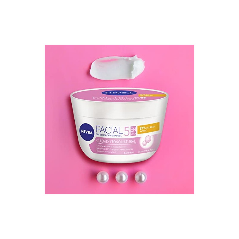 Complementa tu rutina de cuidado facial con nuestra crema facial hidratante 5 en 1 Aclarado Natural de NIVEA. Su innovadora fórmula contiene Hidro nutrientes que al entrar en contacto con la piel del rostro se funden llegando hasta la capa más profunda proporcionando una hidratación intensiva, sin dejar residuos grasosos en la superficie. Aclarara las manchas de la piel gracias a su ingrediente activo de extracto de perla, rápida absorción y textura ligera al mismo tiempo que protege tu piel de los rayos del sol gracias a su protección solar FPS15. Nuestra crema facial brinda 24hrs de humectación sin sensación grasosa, nutrición gracias a su ingrediente manteca de karité, rápida absorción y textura ligera. Puede usarlo todos los días en toda su piel, ya que se absorbe rápidamente y está dermatológicamente aprobado para ser utilizado en la piel de la cara y el cuerpo. Funciones y beneficios La crema facial hidratante NIVEA 5 en 1 Aclarado Natural proporciona una rápida absorción e hidratación hasta por 24 horas. Recupera el tono natural de tu piel gracias a los ingredientes claves de nuestra crema facial aclaradora como lo es el extracto de perla.