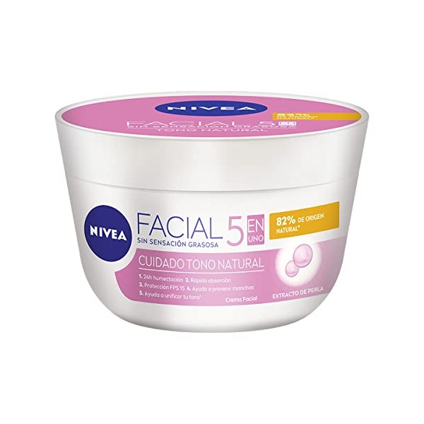 Complementa tu rutina de cuidado facial con nuestra crema facial hidratante 5 en 1 Aclarado Natural de NIVEA. Su innovadora fórmula contiene Hidro nutrientes que al entrar en contacto con la piel del rostro se funden llegando hasta la capa más profunda proporcionando una hidratación intensiva, sin dejar residuos grasosos en la superficie. Aclarara las manchas de la piel gracias a su ingrediente activo de extracto de perla, rápida absorción y textura ligera al mismo tiempo que protege tu piel de los rayos del sol gracias a su protección solar FPS15. Nuestra crema facial brinda 24hrs de humectación sin sensación grasosa, nutrición gracias a su ingrediente manteca de karité, rápida absorción y textura ligera. Puede usarlo todos los días en toda su piel, ya que se absorbe rápidamente y está dermatológicamente aprobado para ser utilizado en la piel de la cara y el cuerpo. Funciones y beneficios La crema facial hidratante NIVEA 5 en 1 Aclarado Natural proporciona una rápida absorción e hidratación hasta por 24 horas. Recupera el tono natural de tu piel gracias a los ingredientes claves de nuestra crema facial aclaradora como lo es el extracto de perla.