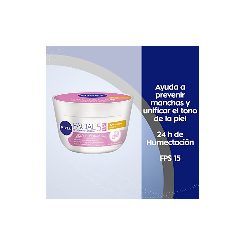 Complementa tu rutina de cuidado facial con nuestra crema facial hidratante 5 en 1 Aclarado Natural de NIVEA. Su innovadora fórmula contiene Hidro nutrientes que al entrar en contacto con la piel del rostro se funden llegando hasta la capa más profunda proporcionando una hidratación intensiva, sin dejar residuos grasosos en la superficie. Aclarara las manchas de la piel gracias a su ingrediente activo de extracto de perla, rápida absorción y textura ligera al mismo tiempo que protege tu piel de los rayos del sol gracias a su protección solar FPS15. Nuestra crema facial brinda 24hrs de humectación sin sensación grasosa, nutrición gracias a su ingrediente manteca de karité, rápida absorción y textura ligera. Puede usarlo todos los días en toda su piel, ya que se absorbe rápidamente y está dermatológicamente aprobado para ser utilizado en la piel de la cara y el cuerpo. Funciones y beneficios La crema facial hidratante NIVEA 5 en 1 Aclarado Natural proporciona una rápida absorción e hidratación hasta por 24 horas. Recupera el tono natural de tu piel gracias a los ingredientes claves de nuestra crema facial aclaradora como lo es el extracto de perla.