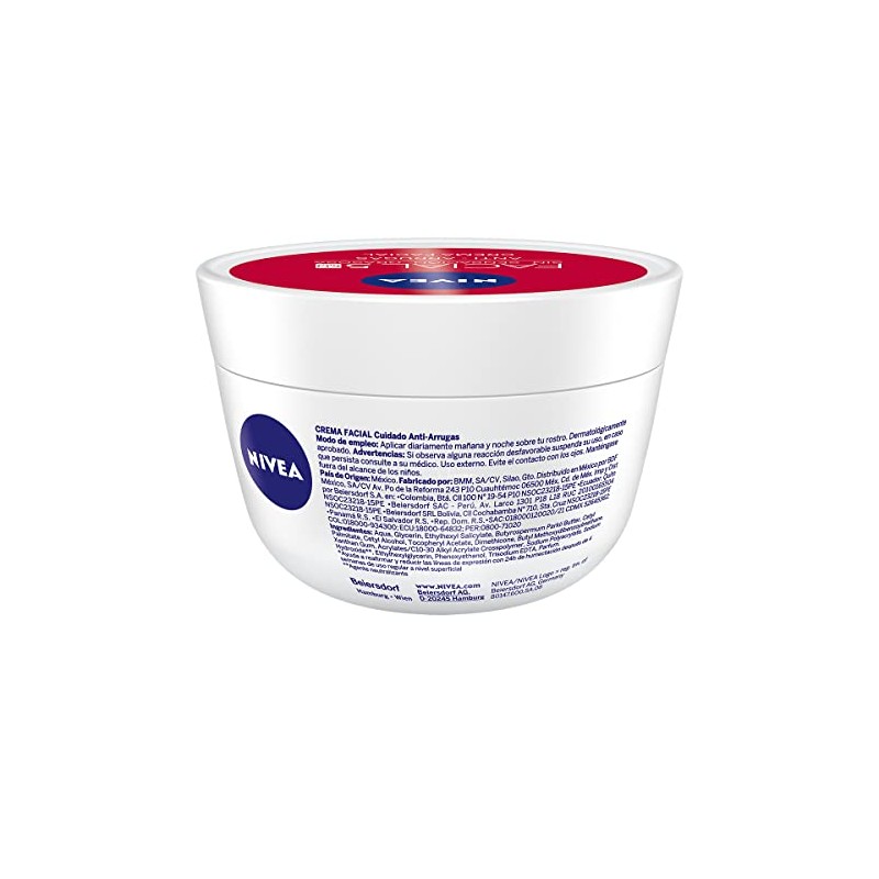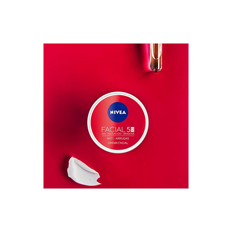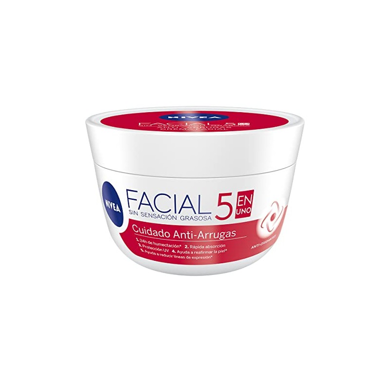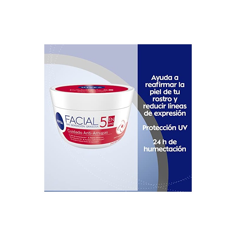 Complementa tu rutina de cuidado facial con nuestra crema facial hidratante 5 en 1 Anti Arrugas NIVEA. Su innovadora fórmula contiene Hidro nutrientes que al entrar en contacto con la piel del rostro se funden llegando hasta la capa más profunda proporcionando una hidratación intensiva, sin dejar residuos grasosos en la superficie. Previene el envejecimiento con Antioxidantes, rápida absorción y textura ligera. Formula con protección UV y Vitamina E, que actúa como antioxidante para prevenir las arrugas en la piel y neutralizar los radicales libres. Nuestra crema facial brinda 24hrs de humectación sin sensación grasosa, nutrición gracias a su ingrediente manteca de karité, rápida absorción y textura ligera. Puede usarlo todos los días en toda su piel, ya que se absorbe rápidamente y está dermatológicamente aprobado para ser utilizado en la piel de la cara y el cuerpo.