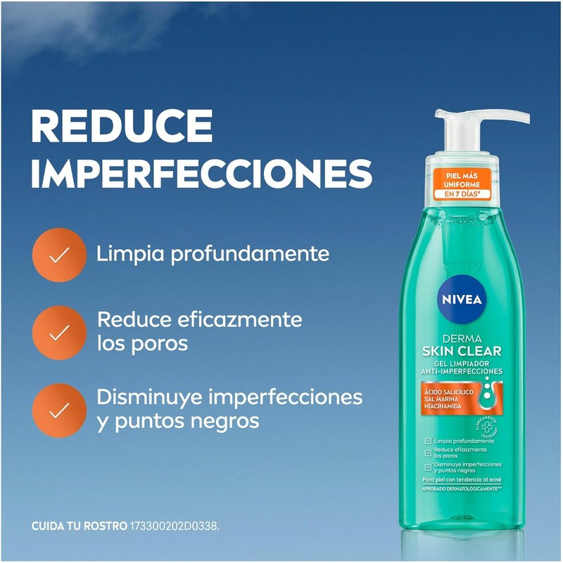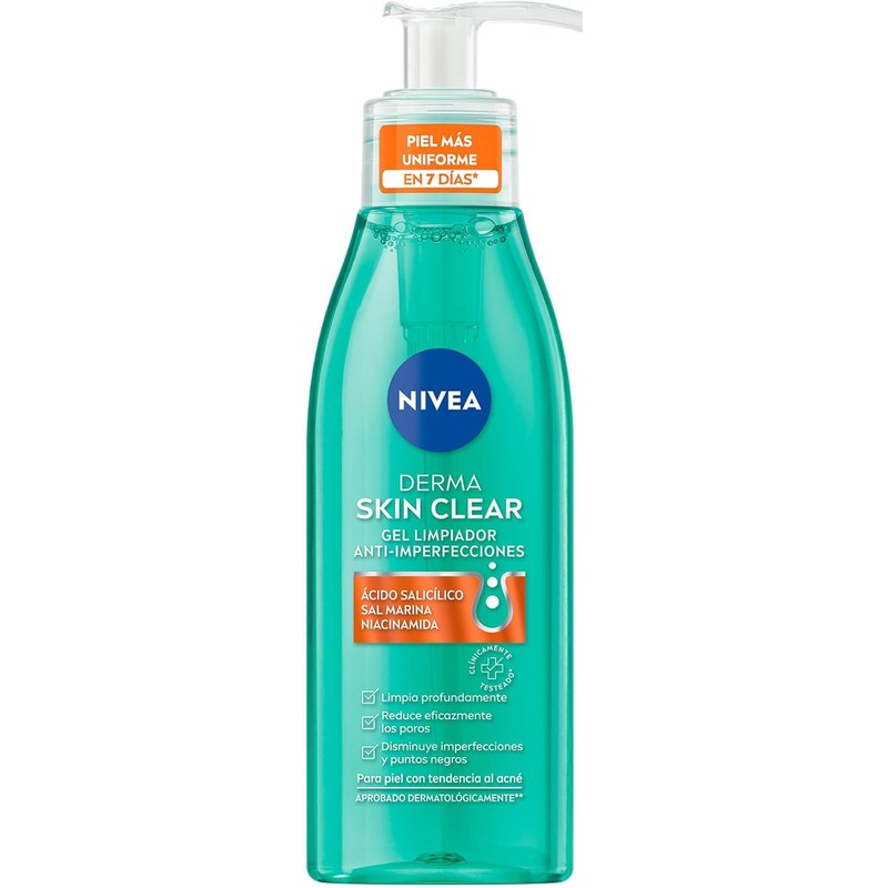 El nuevo NIVEA Derma Skin Clear Gel Limpiador Anti-Imperfecciones limpia profundamente la piel, ayudando a reducir eficazmente los poros dilatados, disminuye las imperfecciones y puntos negros, logrando una mejora visible en la textura de la piel. Gracias a su fórmula concentrada con Ácido Salicílico, Sal Marina y Niacinamida, logra una piel más uniforme, suave y libre de imperfecciones en tan solo 7 días de uso continuo. Su fórmula vegana, que ha sido aprobada dermatológicamente, es ideal para pieles con tendencia al acné, ayudando a controlar la aparición de brotes y proporcionando una sensación de frescura y limpieza. Perfecto para el cuidado diario, dejando la piel más limpia, equilibrada y libre de impurezas. Utiliza la rutina completa de NIVEA Derma Skin Clear para mejores resultados.