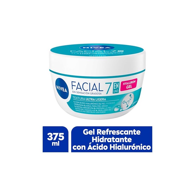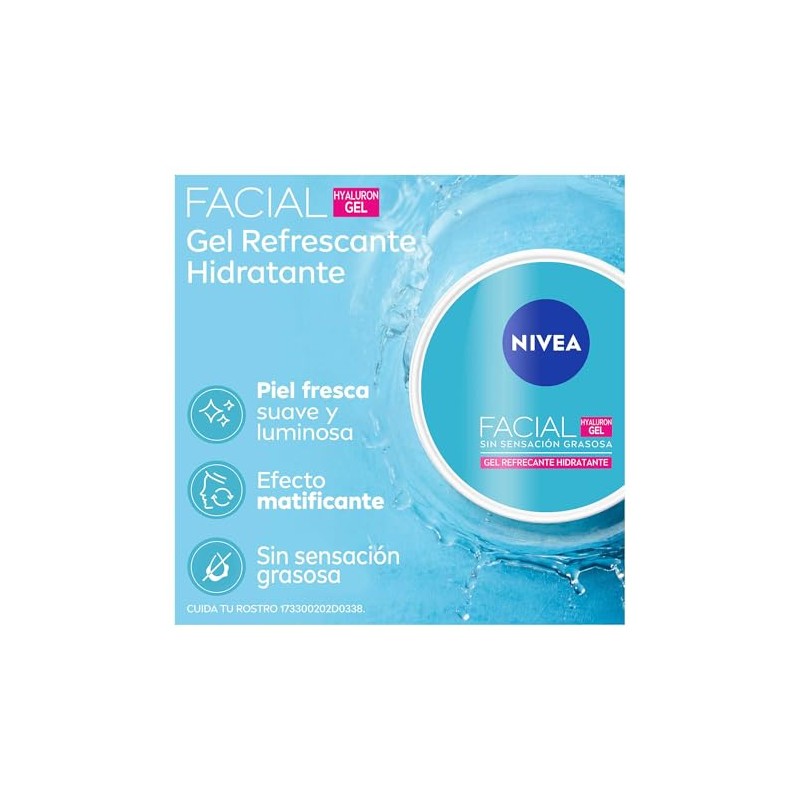 "Cuida la piel de tu rostro con el gel facial de NIVEA Cuidado Facial Hyaluron Gel sin sensación grasosa. Nuestro gel facial con innovadora fórmula combina una textura ligera con el poder hidratante del Ácido Hialurónico para una piel extra hidratada y fresca todo el día. El gel facial hidratante está enriquecido con Ácido Hialurónico que aporta elasticidad a la piel, ayudándo a mantenerla hidratada por más tiempo luciendo más luminosa y radiante. Su textura ligera en gel no obstruirá los poros de tu piel dejándola respirar. Modo de uso: Aplicar suavemente sobre el rostro limpio. Esperar 60 segundos para que el producto sea absorbido en su totalidad. Funciones y beneficios Disfruta de una piel fresca, suave y naturalmente luminosa. Ideal para pieles grasas a mixtas. 24h de hidratación gracias al ácido hialurónico. 100% libre de grasa."