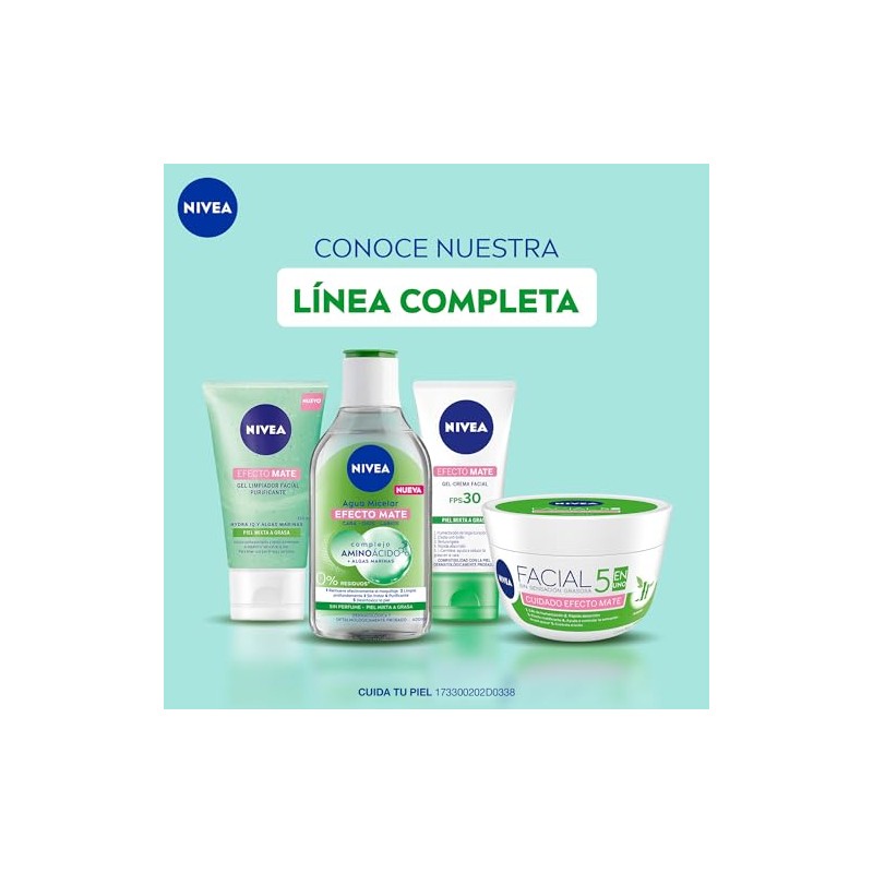 El Gel Limpiador Facial y Purificante Efecto Mate de NIVEA, formulado con algas marinas y agua purificada, proporciona el mejor cuidado para tu piel. Esta fórmula especial limpia profundamente la piel mientras respeta su equilibrio de humedad. Además, el gel exfoliante no contiene microplásticos y ayuda a reducir el exceso de sebo, evitando así el brillo no deseado gracias a su fórmula purificante. MODO DE USO: Aplica el gel facial masajeando suavemente en círculos ascendentes sobre el rostro, cuello y escote previamente humedecidos, evitando el área de los ojos. Luego, enjuaga con agua tibia. Este gel es adecuado para pieles grasas y mixtas. Además, su compatibilidad cutánea ha sido aprobada dermatológica y oftalmológicamente. BENEFICIOS Exfoliante facial que ayuda a abrir los poros y descongestionar la piel. Ayuda a reducir el exceso de sebo, previniendo el brillo y manteniendo la barrera protectora natural de la piel.