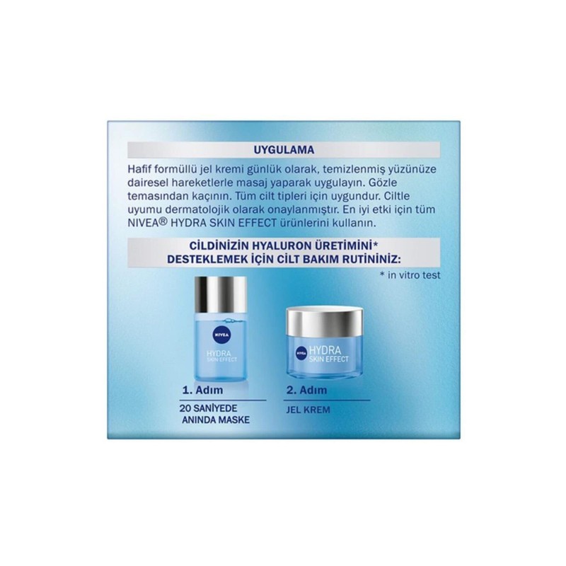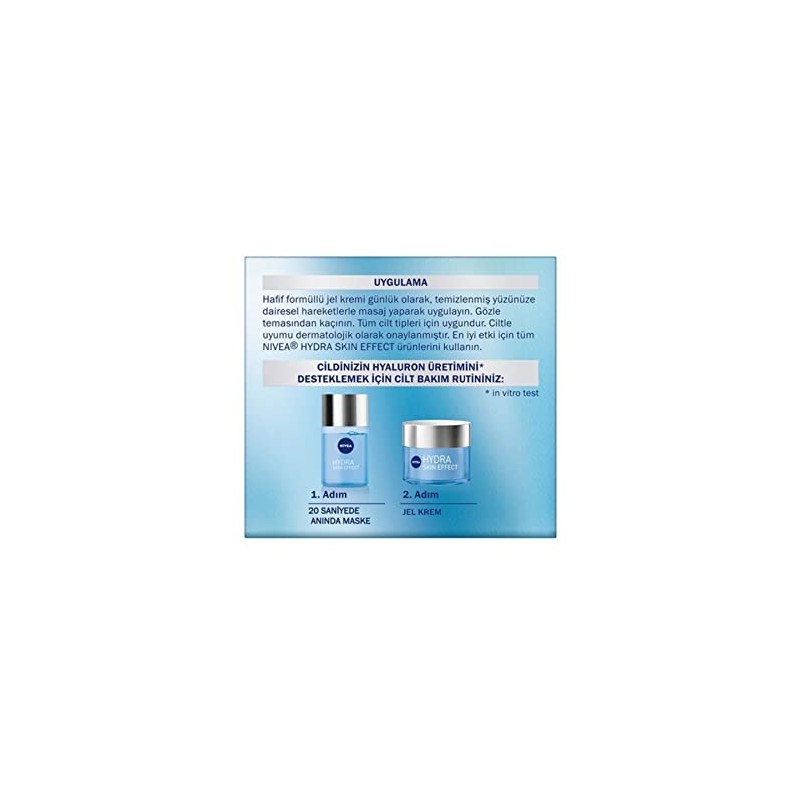 - Saf Hyaluron ( HA) : Nivea Hydra Skin Effect Nemlendiri Jel krem, saf hyaluron ile desteklenen inovatif formülüyle, cildi kendi hyaluron üretimini tetikler