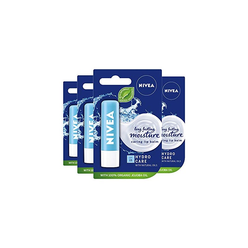 NIVEA Lip Balm Hydro Care with SPF 15 Pack of 4 (4 x 4.8g), Hydrating Lip Balm with Aloe Vera, Moisturising Lip Care with Natural Oils for 12h Moisture Care, Lip Balm SPF 15