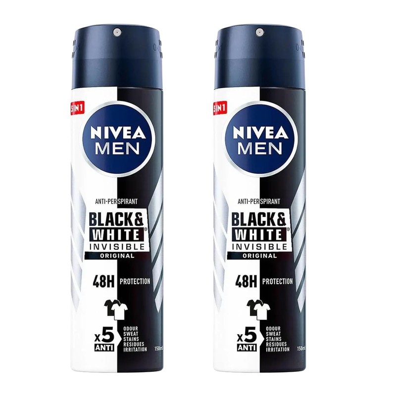 NIVEA Men Invisible for Black & White Original Anti-Perspirant Deodorant Spray 150ml | 48H Protection | No White Marks or Yellow Stains | No Ethyl Alcohol | Fresh Scent | Quick-Dry, 2 Packs