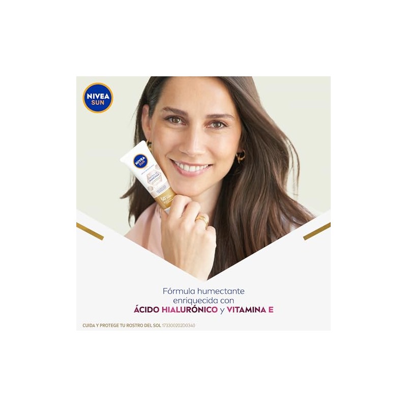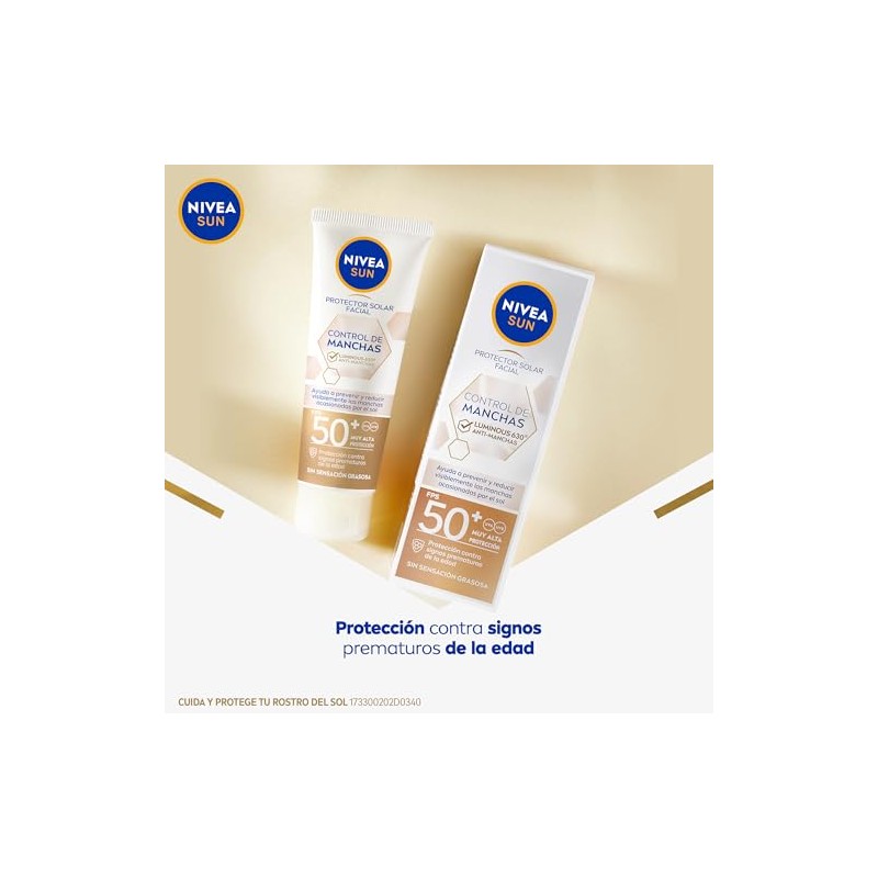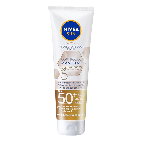 El nuevo protector solar facial NIVEA SUN Control de Manchas Luminous 630 ayuda a prevenir y reducir visiblemente las manchas ocasionadas por el sol, mientras protege tu rostro contra los rayos UVA/UVB. Proporciona una protección solar inmediata y eficaz FPS 50+ contra los rayos UVA/UVB, su fórmula hidratante tiene un sensación refrescante y sin sensación grasosa que ayuda a prevenir el rostro de los signos prematuros de la edad y reducir manchas gracias al ingrediente activo Luminous 630, resultados visibles en 4 semanas. Aprobada dermatologicamente. MODO DE USO: Aplicar el protector solar facial NIVEA SUN control de manchas Luminous 630 entre 3 y 4 veces al día. Para mejores resultados utiliza la rutina facial completa de Luminous 630, aplicando primero el serum anti manchas y después el fluido facial anti manchas, después de 3 horas aplica el protector solar facial para continuar con la protección solar en tu rostro. Hace más de 130 años, inventamos el cuidado de la piel moderna con NIVEA Creme. El día de hoy, millones personas alrededor del mundo de todo tipo de piel, confían en la marca de NIVEA. Nuestros investigadores trabajan extensivamente con diferentes tipos de piel – sensibles a diferentes métodos que se requieran dependiendo de la cultura, edad y género. Beneficios y resultados: Protector solar facial de sensación ligera Recomendado para todo tipo de piel Protección solar contra rayos UVB/UVA Ayuda a prevenir el daño ocasionado por los rayos del sol