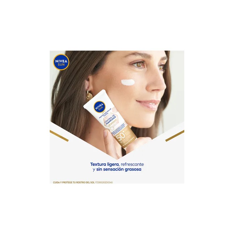 Descripción Limpia: El protector solar facial NIVEA SUN Control de Manchas Luminous 630 ayuda a prevenir y reducir visiblemente las manchas ocasionadas por el sol, mientras protege tu rostro contra los rayos UVA/UVB. Proporciona una protección solar inmediata y eficaz FPS 50+ contra los rayos UVA/UVB. Su fórmula hidratante tiene una sensación refrescante y sin sensación grasosa que ayuda a prevenir los signos prematuros de la edad y reducir manchas gracias al ingrediente activo Luminous 630, con resultados visibles en 4 semanas. Aprobada dermatológicamente.
