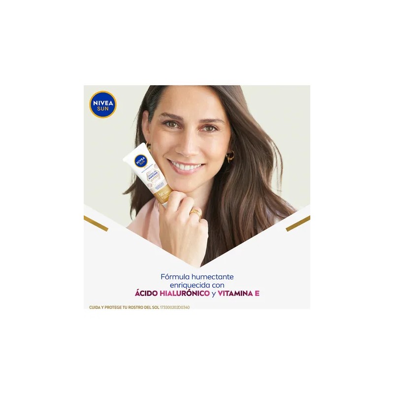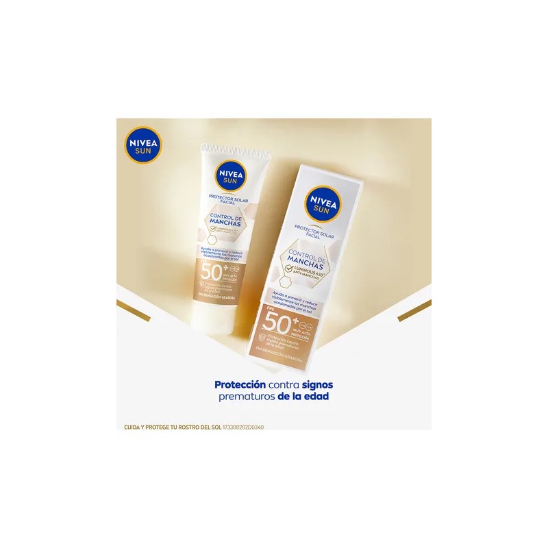 El protector solar facial NIVEA SUN Control de Manchas Luminous 630 ayuda a prevenir y reducir visiblemente las manchas ocasionadas por el sol, mientras protege tu rostro contra los rayos UVA/UVB. Proporciona una protección solar inmediata y eficaz FPS 50+ contra los rayos UVA/UVB. Su fórmula hidratante tiene una sensación refrescante y sin sensación grasosa que ayuda a prevenir los signos prematuros de la edad y reducir manchas gracias al ingrediente activo Luminous 630, con resultados visibles en 4 semanas. Aprobada dermatológicamente.