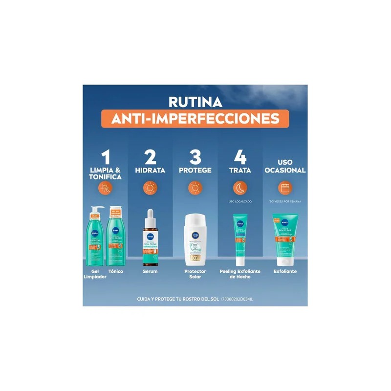 El protector solar facial NIVEA Sun Derma Skin Clear está formulado especialmente para proteger tu piel mientras combate imperfecciones. Su exclusiva fórmula con Niacinamida y complejo anti-imperfecciones ayuda a prevenir brotes y controla la producción de grasa, manteniendo tu piel limpia y equilibrada. Ofrece protección solar muy alta (FPS 50+) contra los rayos UVA/UVB y los efectos de la luz visible de alta energía, garantizando una defensa eficaz para tu rostro durante todo el día.