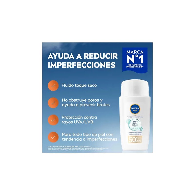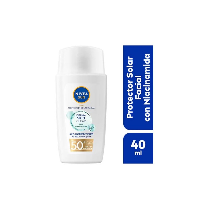 NIVEA SUN Protector Solar Facial Derma Skin Clear Anti-Imperfecciones FPS50 40ml con Niacinamida, previene brotes y no obstruye poros, ideal para piel grasa y/o con tendencia al acné