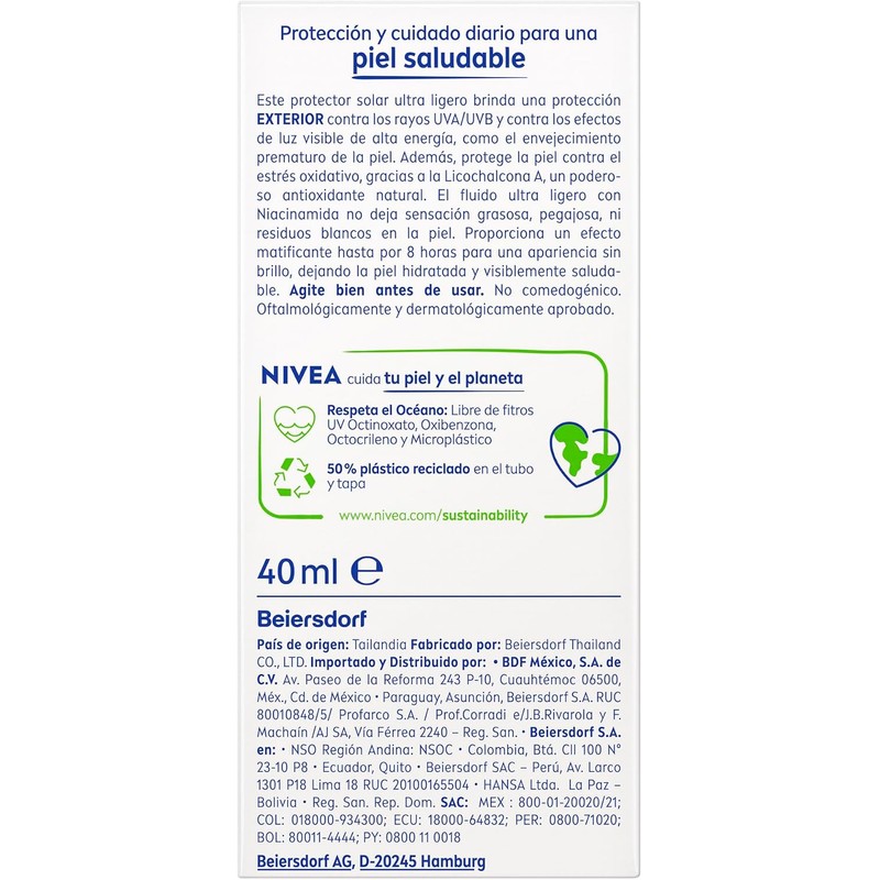 NIVEA SUN Protector Solar Facial Fluido Diario con Niacinamida (40 ml) Efecto Mate y Antioxidantes, FPS 50+ UVA/UVB, Refrescante, ligero y no grasoso