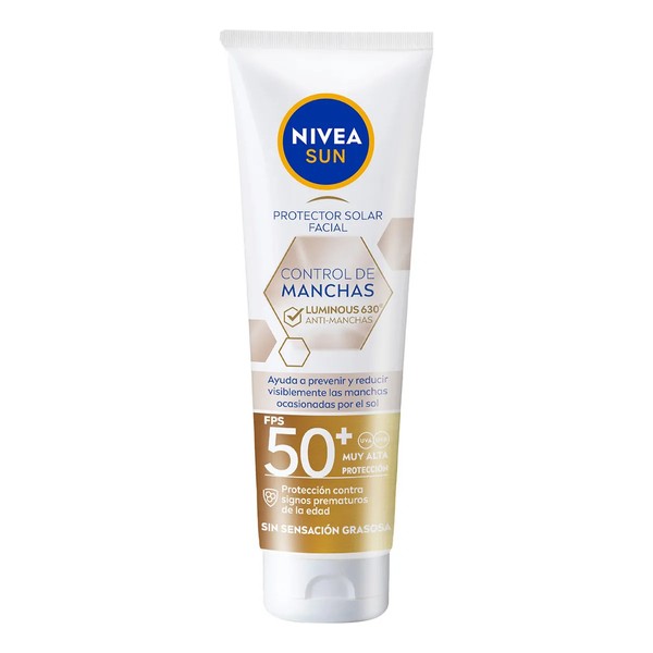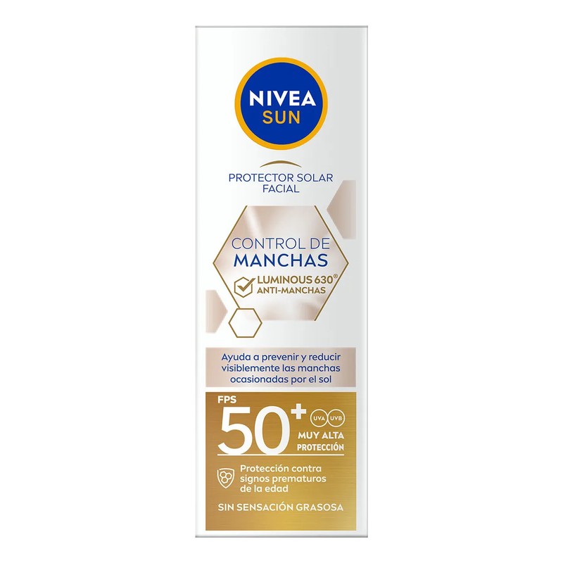 Protege tu piel y previene manchas con el Protector Solar NIVEA SUN Luminous630 FPS 50 ✨. Su fórmula de rápida absorción con Ácido Hialurónico es perfecta para uso diario. 💖