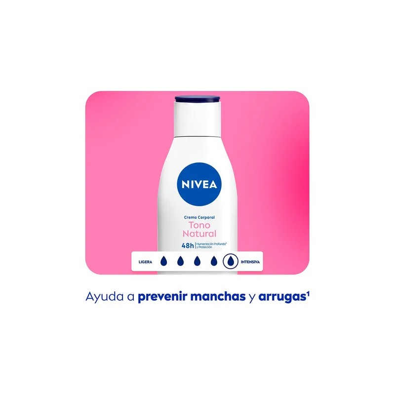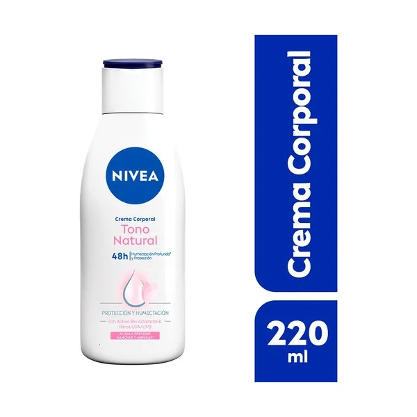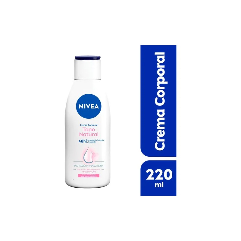 Nivea Tono Natural 220ml. Crema corporal aclarante que hidrata por 48 horas y protege contra rayos UVA/UVB. ¡Para una piel suave y de tono uniforme!