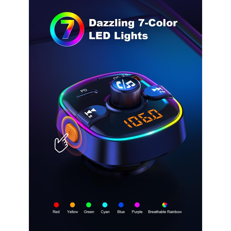 - LED Ambient Light Design: The vibrant 7-color light design of wireless radio adapter car charger adds energy to your driving experience, ensuring effortless visibility even in the dark. You can personalize the lighting using the light control button and enjoy the soothing breathing mode by long-pressing it. To turn off the lights, simply press the button 7 times.