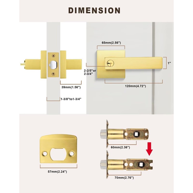 - 【Adjustable Latch】 The interior door latch can be adjusted for 2 3/8" (60mm) or 2 3/4" (70mm). Our front door handles fit door thicknesses of 1 3/8'' (35mm) to 1 3/4" (45mm) . Notice: The latch plate is square, and can't removable.