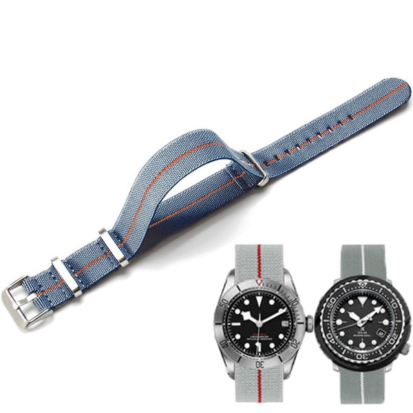 - 【Highquality Elastic Nylon】A cross between a traditional NATO with parachute strap elastic fabric for the perfect balance of style and comfort. it's a high-density nylon strap, can withstand high tension and remain elastic. A brushed stainless steel buckle Hardware: Stainless steel tang buckle, and 3 keepers (one floating to allow for adjustment to any wrist size). Heat sealed edges, smooth woven fabric, and color-matched bonded nylon thread resist fraying to keep your strap looking new.