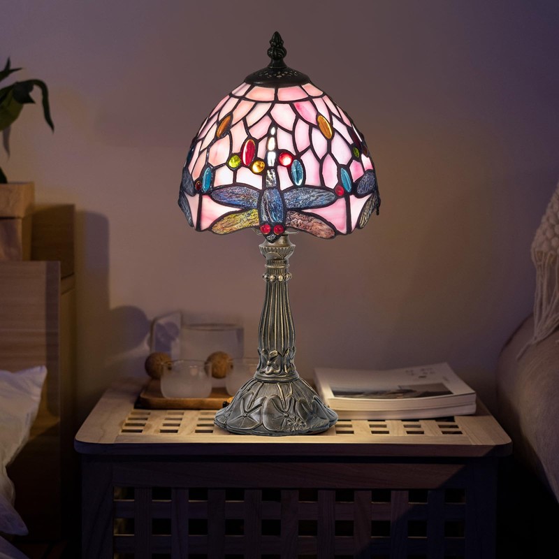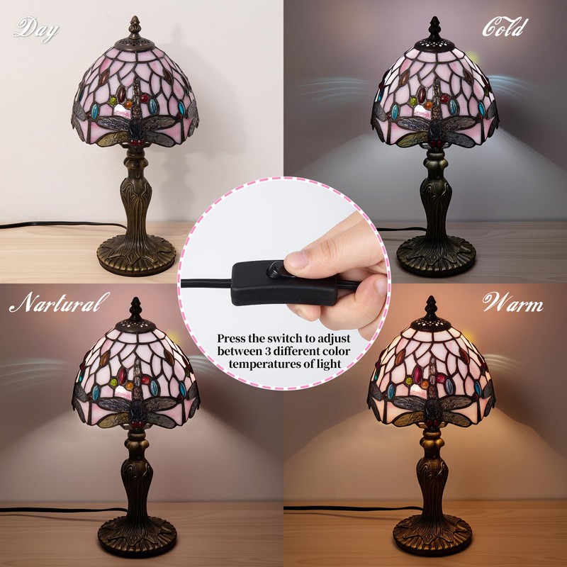 Nizrsky Tiffany Table Lamp,3 Color-Temperature Dragonfly Stained Glass Lamp,8 Inch Tiffany Style Lamp for Bedroom Living Room Home, Handcrafted Light, Included Bulb (Pink)