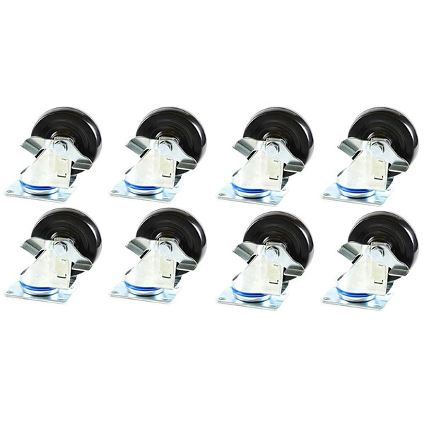 NK 3-inch Hard Rubber Wheel Swivel Plate Casters with Brake, Set of 8