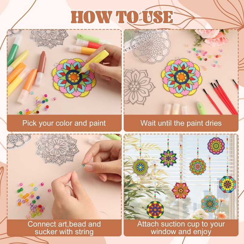 - Mandala Suncatchers Craft Kits Bulk: DIY window suncatchers crafts kit in the kit 32 piece Sun Catcher Craft Kit in 8 different styles, 4 pieces of each design, 20 bottles of 10 rainbow coloured sunscreen paints (6 ml each),1 strip of 6 colours of glow-in-the-dark paints (5 ml each), 32 paintbrushes, 360 pcs acrylic beads, 32 suction hooks,1 roll of "787 in fishing thread. Fishing line,a hole in the top of each visor for hanging, and crafts Rich and beautiful combinations for your DIY crafting needs.