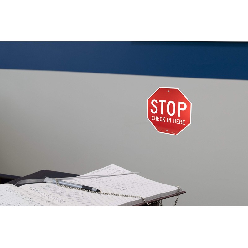 NMC National Marker SS4R NMC Warning Sign, Stop, Check in HERE”, 12” Height x 12” Width, Rigid Plastic, White on Red
