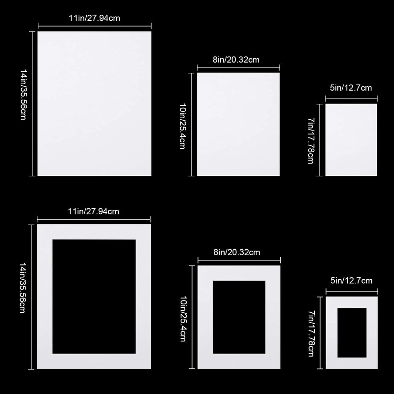 • Hold your photos: the 5 x 7 inches mats have designed with bevel corner interior opening of 3.5 x 5 inches, the 8 x 10 inches mats have designed with bevel corner interior opening of 5 x 7 inches, the 11 x 14 inches mats have designed with bevel corner interior opening of 8.18 x 11.61 inches, their white back panels have no openings, which are approx. 1 mm in thickness, with appropriate thickness to wrap and hold the photo and prevent it from dust, dirt or water.