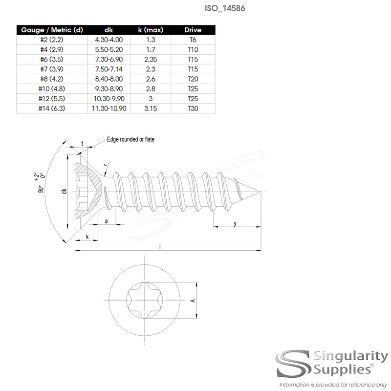 No.4 x 0.25 (2.9mm x 6.5mm) TX Countersunk Self-Tapping Screw - Stainless Steel (A2) (Pack of 20). A fully-threaded screw, with a countersunk head housing a hexalobular socket and a self-tapping tip, designed to fit flush with surfaces. Although sometimes known as 'Sheet Metal' screws these are suitable for a wide number of applications, and can be used with many different materials, including wood and plastics.: ISO: 14586 AFNOR/NFE: 25-656 BS: 4174 UNI: 14586 Size: 2.9 Length: 6.5mm Length: 1/4In Thread: Self Tapping Drive: Hexalobular Head: Countersunk Gauge: 4