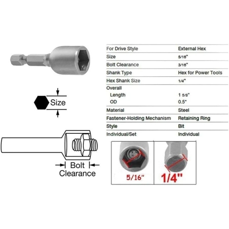 - Hex Socket Size : 8mm/ 5/16"; Hex Shank Size : 6.35mm/ 1/4"
