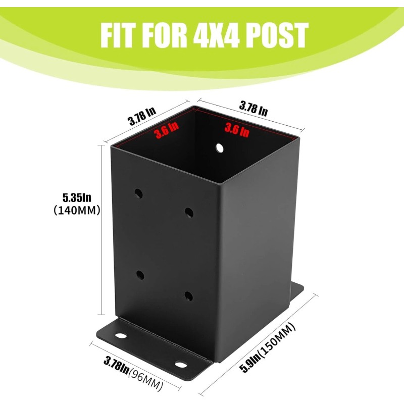 - 【For 4×4 Post】Outer Size: 5.9"x3.7"x5.5",Inner size: 3.6"x3.6".Deck post base fits 4x4 inches (actual size 3.5x3.5 inches) wood posts.