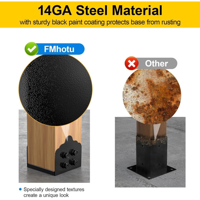 - 【Fit Size】The 6x6 post base is suitable for wooden posts with the standard size of 6" * 6" (actual 5.5"x 5.5" on market), Our half-open design increases the size range to fit 5.5 "x 5.5", 5.8 "x 5.5", 6 "x 5.5" wood posts. The post base can be used on existing concrete and wooden floor